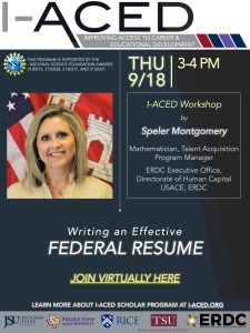 Join us for the I-ACED Federal Resume Writing Workshop by Speler Montgomery on Thursday, September 18, 2025, 3-4 PM.